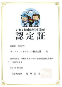 「いわて健康経営認定事業所」認定 2026年04月28日 令和8年4月1日付けで岩手県より「令和8年度 いわて健康経営認定事業所」に認定されました。 今後も社員の健康増進に向けて、健康経営に努めてまいります。 投稿ナビゲーション PREVNEXT